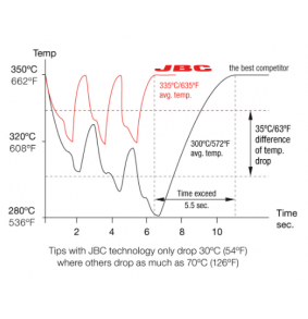 Comme tous les outils JBC, B·iRON est doté du système de chauffage exclusif JBC assurant une récupération extrêmement rapide de la température atteignant 350°C en moins de 4 secondes.